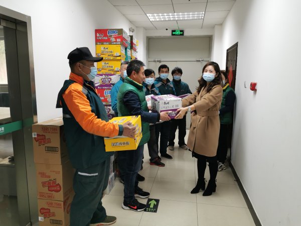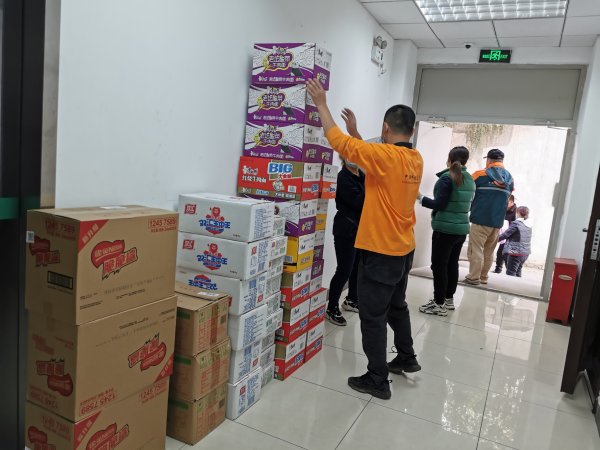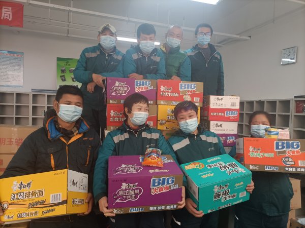 石景山区分公司工会赶在双11到来之前,集中采购了火腿肠、方便面、榨菜、面包、牛奶、巧克力等食物,工会主席侯娅梅亲自带着慰问品,慰问奋战在一线的投递员。