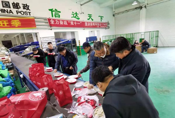 第三组由西安区和东安区两个分公司的职工组成。为了能让邮件尽快转运出口,慰问组人员一起参与到了邮件的装卸转运工作中。他们不怕脏不怕累,和其他14名队员一样挥汗如雨,装卸邮包,让在场的所有队员都深受感动。由于赶上周末,为了不再麻烦食堂送餐,慰问组为队员们买来了热腾腾的饺子,并在餐后又投入到了邮件的转运工作中。一线员工深受感动,纷纷表示,要以最饱满的状态、最坚定的斗志迎接即将到来的双十一攻坚战。