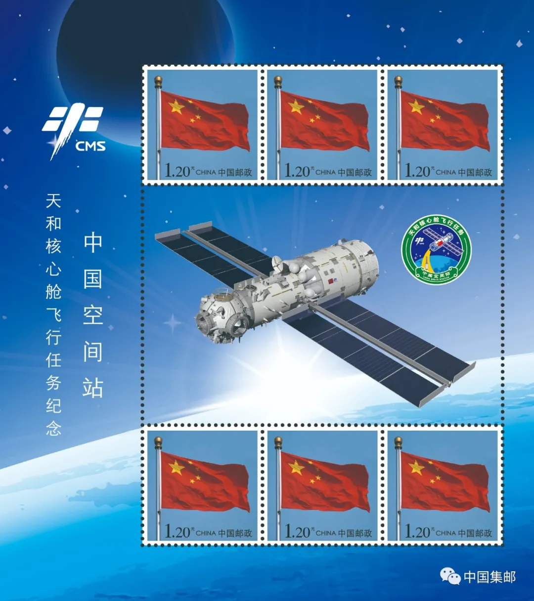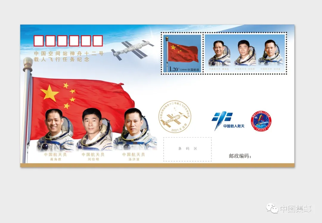 本邮折收录的6枚版《国旗》主图个性化邮票表现了天和核心舱、天舟二号和神舟十二号飞船组合体画面以及执行任务的三位航天员肖像,完整展现了本次飞行任务。