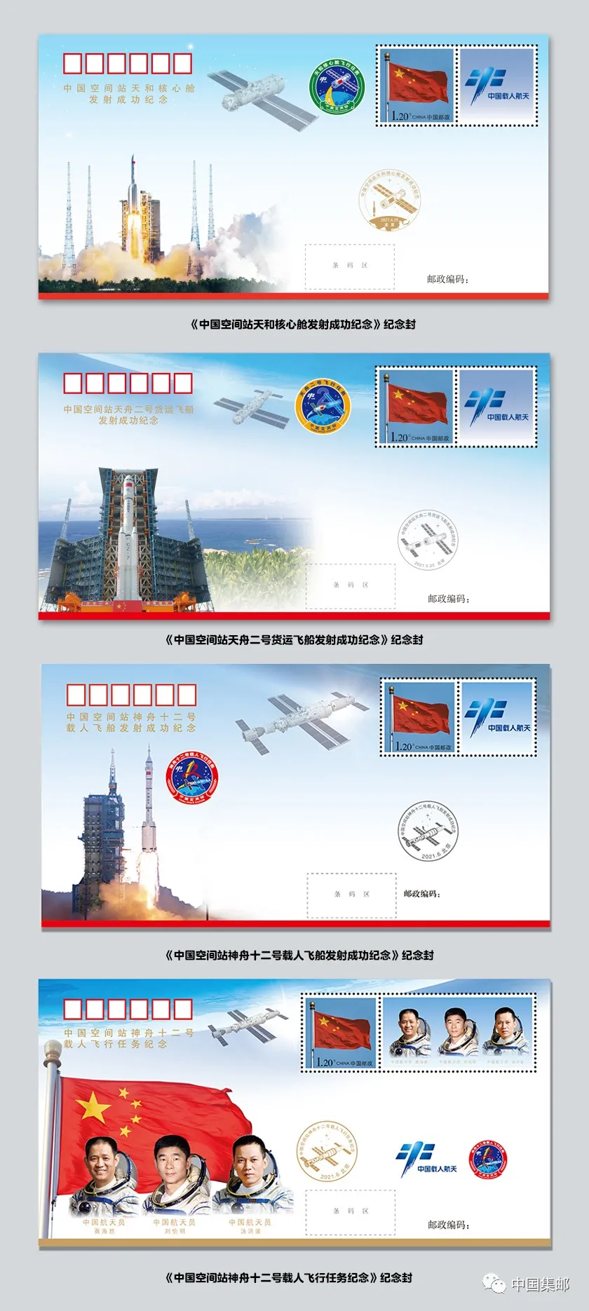 以纪念封形式完整记录下我国完成中国空间站在轨组装建造任务卓越成就的《天和核心舱发射成功纪念封》、《天舟二号货运飞船发射成功纪念封》、《神舟十二号载人飞船发射成功纪念封》、《神舟十二号载人飞行任务纪念封》均收入册中。