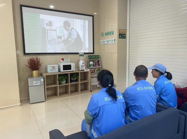 水果湖邮爱驿站设置在网点的一角,户外工作者时常会来歇歇脚,小憩一下,补充点水分。为丰富服务内容,每天网点电视会滚动播放防诈骗视频、邮爱驿站宣传片、劳模宣传片等,让户外工作者在给身体“充电”的同时,也能通过观影,给精神世界“充电”。
