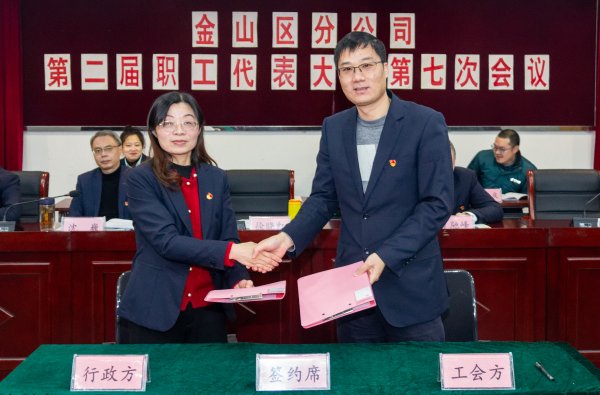 区分公司副总经理(主持工作)徐晓红代表行政方、区分公司工会主席高杰斌代表工会方共同签订了《中国邮政集团有限公司上海市金山区分公司2024年实事项目方案》。