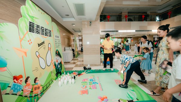 欢乐嘉年华活动现场则充满了欢声笑语,孩子们在家长的陪伴下,尽情享受着游戏的乐趣。暖场气球小丑的表演引得孩子们阵阵欢笑;花朵积木手工区里,孩子们发挥着自己的想象力,拼搭出各种美丽的造型;翻滚保龄球和趣味遛狗项目则考验着孩子们的手眼协调能力和团队合作精神;而蒙眼捞零食项目更是让家长们也参与其中,亲子间默契配合,其乐融融。
