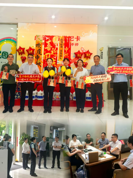 在物资准备与现场氛围营造上,各地既贴合需求又注重激励。猪肉、鱼肉成为慰问“标配”,贵港额外准备熟食与能量礼包,防城港补充奶茶等物资,百色更从合作商户采购慰问品,深化银商联动。活动现场,“聚力奋战爆点必赢”“要吃肉,大干金融;战双节,余额长隆”等励志标语醒目陈列,镜头定格下员工手捧慰问品、斗志昂扬的画面,让温暖关怀与奋斗热情相互交融。