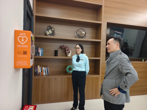 在横街网点负责人的陪同下,陈金彦一行先行参观了驿站各功能区域。从设有茶桌、冰箱的休息区,到存放微波炉、急救箱、血压计、针线盒的便民角,再到户外劳动者的手机充电处、AED除颤仪安装处,每到一处都驻足询问。“平时每天大概有多少户外劳动者来休息?”“有没有组织过户外人员的专场活动?”针对这些问题,网点工作人员逐一详细汇报。