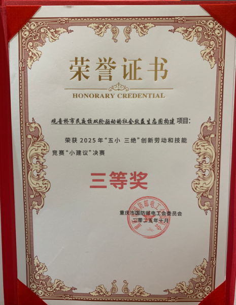 10月29日,重庆市国防邮电工会2025年“劳动创造幸福 技能成就梦想”职工“五小 三绝”创新劳动和技能竞赛总结表彰暨成果展示活动召开,江北邮政工会申报的“观音桥市民夜校双轮驱动的社会效益生态圈构建”项目荣获“小建议”类三等奖。