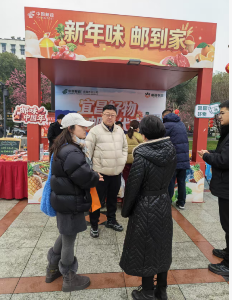 庙会现场,宜昌邮政设立的展位前人气颇旺。五峰的腊肉、香肠,秭归的鲜橙,枝江的大米,点军的蜜柚等来自宜昌各县(市、区)的特色农产品整齐陈列,吸引了不少市民驻足品尝、购买。