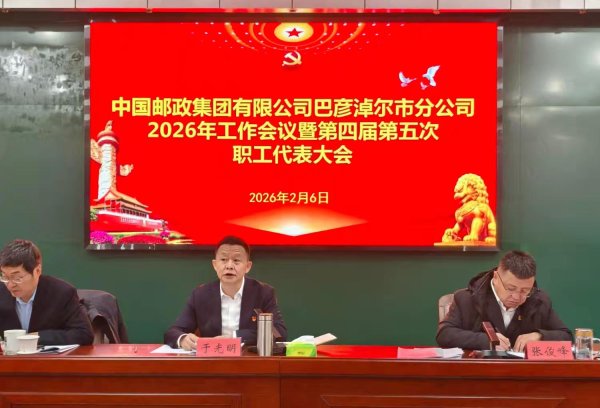 2月6日,巴彦淖尔市邮政分公司召开2026年工作会议暨第四届第五次职工代表大会。会议全面贯彻落实集团公司、区分公司年度工作会议精神和市委市政府决策部署,总结2025年发展成效,系统部署2026年重点任务,动员广大干部职工以实干担当奋力谱写巴彦淖尔市邮政高质量发展新篇章。