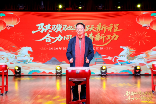 汇演伊始,区分公司总经理、党委书记手持幸运鼓槌,沉稳有力地敲响象征吉祥与奋进的大鼓。铿锵鼓点,寓意浦东邮政新岁将如骏马奔腾、勇毅前行;阵阵鼓声,传递着领导班子对全体员工的新春美好祝福,更凝聚起全体浦邮人 “合力同心铸新功”的坚定信念与奋进力量,拉开了文艺汇演的精彩序幕。