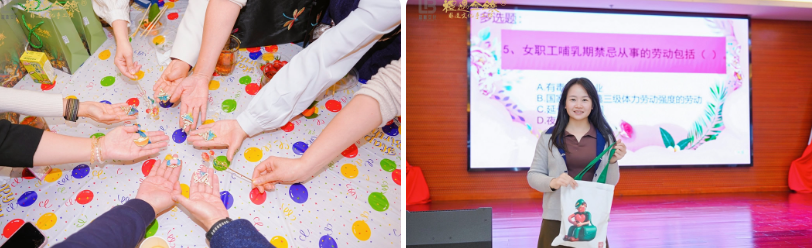 活动现场亮点纷呈、暖意十足。特邀市妇联创业导师、礼遇金镶品牌创始人黄学超老师,现场指导女职工开展掐丝珐琅胸针手工制作,让大家在指尖灵动间感受非遗技艺的匠心魅力,在沉浸式体验中丰富精神文化生活、陶冶情操、舒缓工作压力。同时,围绕妇女权益保护、女职工劳动保护、企业形势任务及企业文化等内容开展趣味有奖知识问答,氛围热烈活跃,既普及了相关知识,也进一步凝聚思想共识,增强女职工对企业发展的认同感与归属感。活动还为获奖先进个人、集体送上《阳光心态》书籍,为知识问答获奖者送上邮政漫画健康包,把暖心关怀精准送到女职工心坎上。