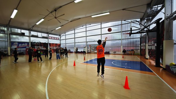 选拔当天,学员们在专业教练的耐心指导下,依次进行了60秒定点投篮、三分球测试、双人全场传球上篮和半场运球测试等技术动作,并进行了3轮全场小组对抗赛。