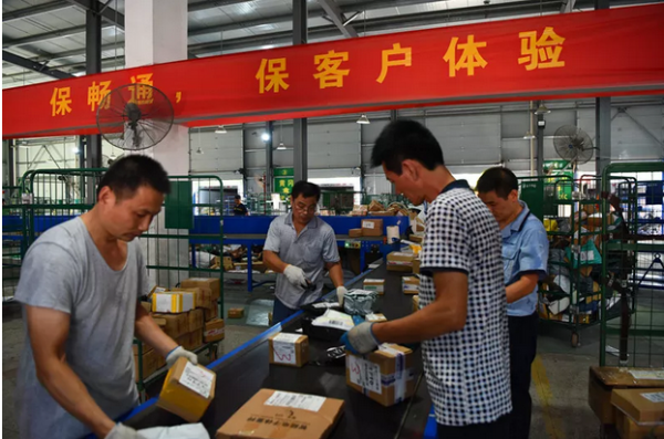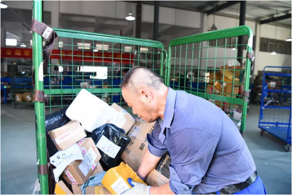 钢结构的处理中心在烈日的炙烤下像一座巨大的烤箱,十几个大功率电扇吹出的是一阵阵热浪,配合着皮带传输机的轰鸣,让人多待一会都会觉得难受。为了保证时限,大大小小的包裹都得快速分拣,分拣员们的衣服以肉眼可见的速度被汗水浸透,工作强度非常大。“每天算上加班车,我们要处理13辆邮车的邮件,有时候量多一点会忙到晚上十点后。”转运中心负责人程波告诉我们。
