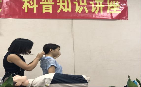 讲座一开始,雷老师老师就心肺复苏的具体操作方法进行了讲解和示范。查看“患者”意识、触摸颈动脉、清除呼吸道异物、打开气道、胸外心脏按压、施行人工呼吸等。随后继续介绍了肩周炎、颈椎病、腰肌劳损等常见办公室职业病的预防知识。并通过现场互动、实际操作等形式,使大家较快地掌握了心肺复苏的具体操作方法以及经络穴位定位、常见职业病预防等常用技巧和知识。