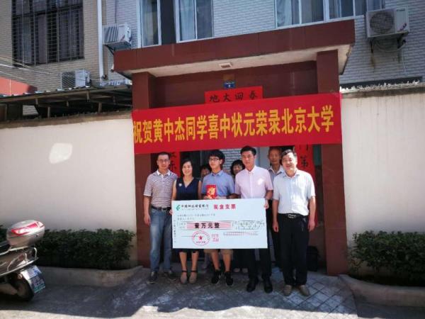 8月3日,黄冈市分公司副总经理、工会主席林卫东、副主席陈文来到麻城分公司干部胡红群的家中,祝贺她的儿子黄中杰以706分的优异成绩勇夺“黄冈高考理科状元”,荣录北京大学。