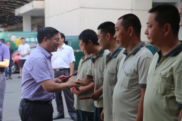 8月8日上午,宜昌市总工会副主席郭从军一行来到宜昌分公司,先后前往伍家岗区杨岔路投递站、速递物流公司伍家揽投部、市分公司网路运营中心开展高温慰问,为坚守在一线的邮政员工送去夏日清凉。