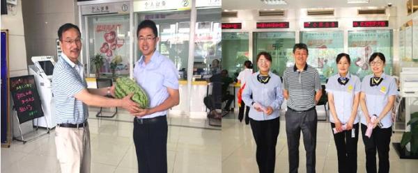 炎炎夏日送清凉,黄山市分行为全行员工统一配发了绿豆、冰糖、藿香正气丸、风油精、驱蚊花露水和其他日化等防暑降温用品,各区县支行也分别开展“夏送清凉”慰问活动。近日上午,市分行行长刘宏平和副行长叶文虎分别携带西瓜和防晒伞前往所属支行开展“送清凉”慰问。每到一处,刘宏平行长和叶文虎副行长把大西瓜送到支行办公室,将防晒伞一一发给客户经理,并询问大家工作和身体情况,叮嘱大家要注意劳逸结合,提醒客户经理外出走访要做好防暑和人身安全防护工作,保持手机联系畅通。同时,要求支行加强消防设施的日常检查和维护工作,既要确保安全度过高温季节,又要确保经营服务工作不滑坡,为完成全年工作目标打下良好基础。