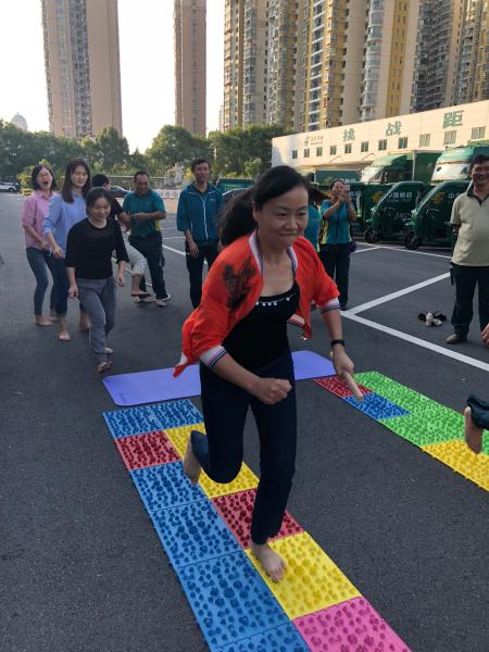 趣味运动会共设计了吹球入碗、共同进步(双人跳绳)、指压板接力赛、拔河等四个项目。