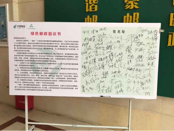 为庆祝第49届世界邮政日,倡导绿色邮政,将芜湖邮政打造成为“绿色运营的践行者,绿色生活的推动者,绿色生态的守护者,绿色品牌的塑造者”,10月9日上午,芜湖邮政工会发起“绿色邮政倡议签名活动”,在办公楼一楼设立签名墙,邀请员工参与活动,在签名墙签名,抒写对芜湖邮政的诚挚祝愿、对绿色邮政的美好向往。活动受到了良好效果,通过签字活动让员工增强了绿色邮政的“仪式感”,也让自己更加自觉把绿色邮政理念投入到日常工作中。