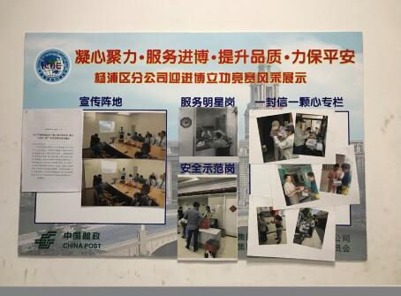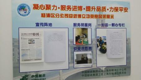同时杨浦区分公司下属各单位积极响应竞赛活动要求,成立了竞赛活动小组,构建“支部领导、行政运作、工会发动、员工参与、全面推进”的竞赛工作格局。分公司工会及时制作下发了杨浦区分公司竞赛活动风采展板,各单位对展板进行了布置、上墙,充分运用员工大会、晨会、班组学习及宣传栏、微信等新媒体手段,对“服务明星岗”、“安全示范岗”、“一封信一颗心专栏”开展情况信息进行宣传推广,发挥先进个人和先进集体在竞赛活动中的示范引领作用。控江路邮政支局更通过网络投票的方式开展“迎进博、树先锋,寻找身边小火花”的行动,寻找“身边的闪光点”好人好事征集,把这些发生在广大职工中的小故事传播给每一位员工,让小故事成为弘扬企业文化的正能量,努力营造“比、学、赶、帮、超”的竞赛活动氛围。(上海邮政工会)