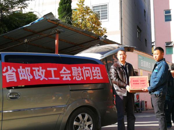 11月6日—11月12日,省分公司资深经理、省邮政工会副主席陈智率省邮政工会同志赴贵阳、毕节、遵义市分公司、寄递事业部慰问基层一线员工,看望慰问战斗在旺季生产经营一线的支局所、投递部的员工,给职工们送上了米、油、罐头等慰问品,送上省分公司党组、省邮政工会的关心和问候,为基层一线“战旺季”加油鼓劲。每到一个支局所,陈副主席都会参观职工小家,与一线员工交谈,了解支局业务发展情况、周边市场竞争情况、员工收入情况,感谢大家对旺季生产付出的努力,并鼓励大家继续奋勇争先,打好旺季攻坚战,努力实现“三个确保”。在职工小家,陈副主席指出,我们的职工小家就是要为基层员工打造优质、温馨的工作环境和生活环境,为基层员工解决吃、住等方面的后顾之忧,工会要在旺季生产经营中发挥娘家人作用,关心关爱基层员工,加强职工小家建设,增强员工归属感,为旺季生产经营贡献力量。