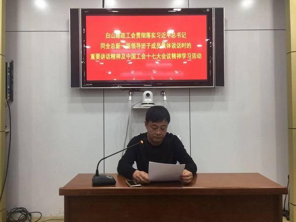 11月14日下午,白山市邮政工会组织开展贯彻落实“习近平总书记同全总新一届领导班子成员集体谈话时的重要讲话精神及中国工会十七大会议精神”学习活动,全体工会委员、各分工会委员及妇联工作人员参加了会议。