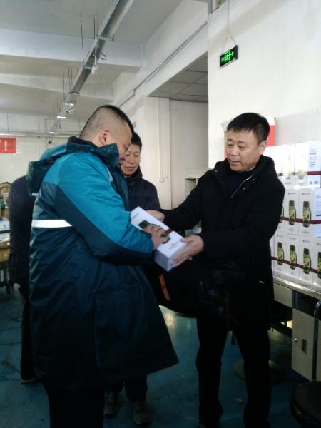 这样关键时点,这样的困难时期,更是时刻牵动着市分公司领导的心,谢瑛华总经理数次亲临现场看望职工,用温暖的话语鼓舞职工们的气势,用实际行动温暖职工。时至小雪,雪至温降,但投递员的心里却是暖意融融,11月22日,谢瑛华总经理带领市邮政工会一行,带着对员工的关心与关爱,来到网运和投递现场,每到一处,谢总都亲切地与职工交流,全面了解双十一工作进展情况。工会为每一名投递员送来了保温水杯,让他们在寒冷的冬天能喝上热水;给每一名外勤投递人员配置了护手、护腿,有效的抵御严寒;为网运和投递员工送来了火腿肠、方便面、面包、酥饼等慰问品,避免大家饿着肚子工作。领导体贴入微的关怀深深感动并鼓舞着每一个员工。