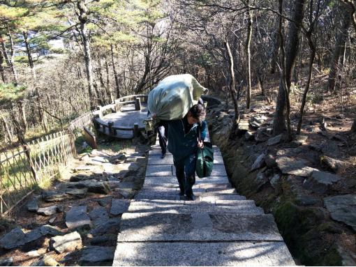 光明顶是黄山风景区第二大高峰,海拔1860米,黄山701台、黄山气象站就坐落在这里。从北海到光明顶的路程有1000多米,全是上行台阶,游步道上的游客到了光明顶都会越走越慢,气喘吁吁,特别是冬季,台阶上结了薄冰,行走更加困难,不小心极易摔倒,谢菲俊每天都要负重近50公斤爬上去,把邮件安全送到用户手中,三年来,他已磨坏了8双运动鞋,个中艰辛可想而知。