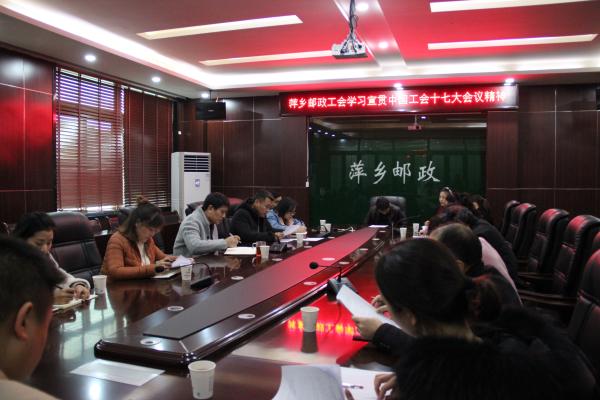 为深入学习贯彻习近平总书记重要讲话精神和中国总工会十七大精神,让各级工会干部自觉落实中国工会十七大会议精神,12月7日下午,萍乡市邮政工会召开了学习宣传贯彻中国工会十七大精神专题会。市邮政工会主席钟勇、副主席柳华及各县区分公司工会主席、市本部各分会主席、部分职工代表共计28人参加了专题学习。