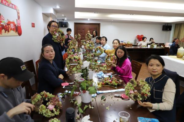 第一个环节是花环制作。分公司员工在花艺师的带领下,用藤条、绣球花、洋牡丹等花材自己动手制作了花环,每位员工充分发挥了自己的想象力,在小小的藤圈上编出了属于自己的特色花环。制作完花环后,大家做好清理又开始进行第二个环节,牛轧糖和雪花酥的制作。