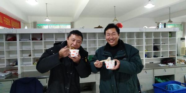 2018年12月23日是中国传统的冬至节气,午饭时间,东西湖区分公司所有网点和投递站一盘盘热气腾腾的饺子上桌,大家围桌而坐,员工们有的调起了自己喜欢的蘸料,有的一口一个吃的欢,每个员工都暂时忘记了旺季生产日夜奋战的疲惫,吃饺子,谈心事,唠家常,其乐融融,午饭时间的邮政网点和投递站充满了节日的热闹与喜庆。