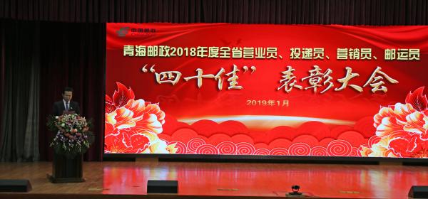 2019年1月18日,2018年度青海邮政最佳营业员、最佳投递员、最佳营销员、最佳邮运员表彰大会在西宁隆重召开,省分公司党组领导班子全体成员参加了表彰会,分别为“四十佳”颁奖,省分公司党组成员、副总经理、省邮政工会主席赵利平代表省分公司党组致辞,省分公司党组成员、省寄递事业部常务副总经理胡建华宣读表彰决定。