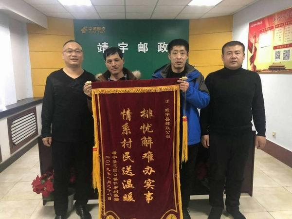 1月31日下午,靖宇县花园口镇仁和村村书记陈安高来到靖宇县邮政分公司,将一面写着"排忧解难办实事、情系村民送温暖"字样的锦旗送到县公司领导班子手中,鲜艳的锦旗代表着村民对靖宇邮政一直以来对仁和村脱贫工作的肯定和为村民解难事、办实事由衷的谢意。