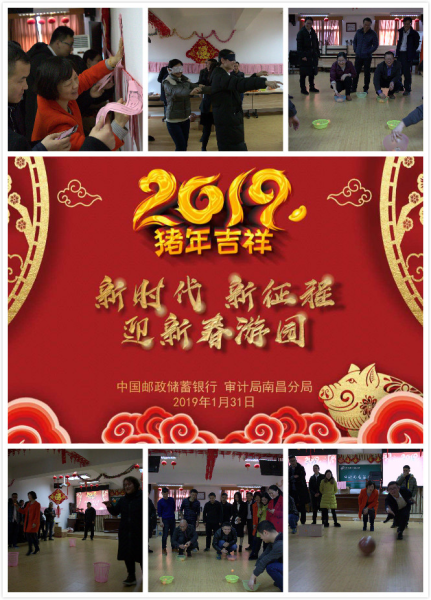 为喜迎新春佳节,丰富职工文化生活,2019年1月31日下午,审计局南昌分局举办“新时代 新征程”“迎新春游园活动。此次活动有:迎新春庆十九大猜谜活动、掌上明珠、超级保龄球、盲人摸金猪、纸杯投球5个项目。分局全体员工热烈参与,现场气氛热烈,高潮迭起。其中,盲人摸金猪游戏把整个活动推向高潮。