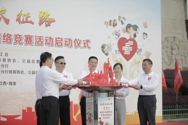 随后,邮储银行工会主席刘敏宣布邮爱公益健步走网络竞赛活动正式启动,并依次将“邮储银行公益志愿者协会”会旗传递给江西省分行行长、党委书记肖天星及公益志愿者代表。而后,由邮储银行工会主席刘敏,总行高级资深经理、江西省分行党委书记、行长肖天星,瑞金市委书记、瑞金经济开发区党工委书记许锐,总行工会副主席郑海英,江西省分行党委委员、副行长、工会主席刘承亚,瑞金市委副书记、市政府副市长李立东6位领导和嘉宾共同点燃出征火炬,并分别传递给6个志愿者方队(共360人)队长。随着三名号手吹响出征军号,这支“邮爱红军”全面开启从当地历史博物馆出发至红井景区约3公里的健步走,将“邮爱”脚印深深记印在革命圣地,传递到每一个角落,向社会不断传递爱心和正能量。