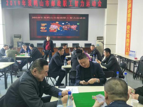 双鸭山市邮政工会于4月4日上午,举办了2019年全市邮政职工三打一比赛活动。此次赛事是为了不断丰富全市邮政职工的业余文化生活,增进职工间的沟通与交流而举办的,同时也将选拔优秀选手参加省邮政工会举办的2019年全省邮政职工智力运动会。三打一比赛共有20名选手参加,分为五个小组。上午8时30分,比赛拉开帷幕,市分公司副总经理、工会主席时红军亲临现场致开幕词。大家在欢声笑语中进行了抽签和分组等程序后立即进行了比赛。赛场上虽然紧张但是却不乏活泼友好氛围,其中既要有合作又要有争斗,三个一伙的也会不时用眼神进行交流和暗示,惹的庄家不得不微笑着提醒“注意牌风哈”;先进行完比赛的选手们驻足观战前四名的争夺赛,比赛在欢乐的气氛中共进行了近4个小时才结束。