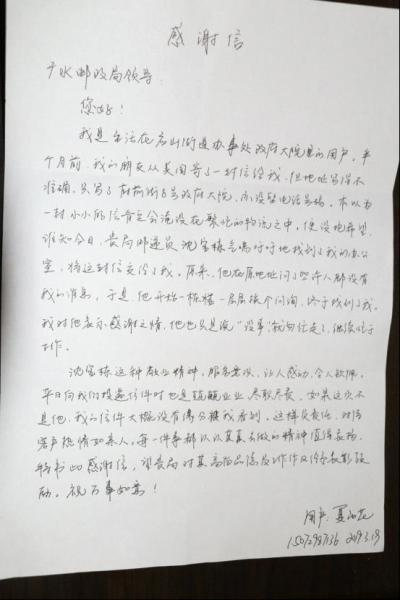 “本以为一封小小的信件肯定会被淹没在繁忙的物流之中,谁知今日,贵局邮递员沈宝栋气喘吁吁的找到了我的办公室,将这封信交给了我。如果这次不是他,我的信件大概没有缘分被我看到。”3月19日,一封手写在白纸上的感谢信被送到广水市邮政分公司总经理办公室。感谢信出自广水市委宣传部新闻科工作人员夏雨花,洋洋洒洒三百余字,感激之情流淌在字里行间。