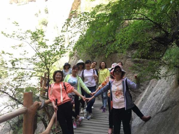 开始爬山啦,大家个个精神抖擞、意气风发,朝着山顶奋力前进。山间峪道窄狭清幽,山路崎岖蜿蜒,河流湍急,山石险峻,多处路段凿崖,加栈凌空通过。尽管有个别伙伴由于身体原因使登山的脚步慢了下来,但他们互相鼓励,相相互搀扶,处处体现着团结的力量 。