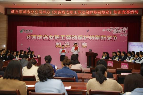 为进一步推动保障女职工权益法律法规的学习和普及,促进保护女职工权益法律法规的贯彻落实,商丘市邮政分公司于近日举办了商丘市邮政系统《河南省女职工劳动保护特别规定》知识竞赛。来自各县(市、区)分公司、市分公司和寄递事业部共11个代表队参加了本次竞赛活动。