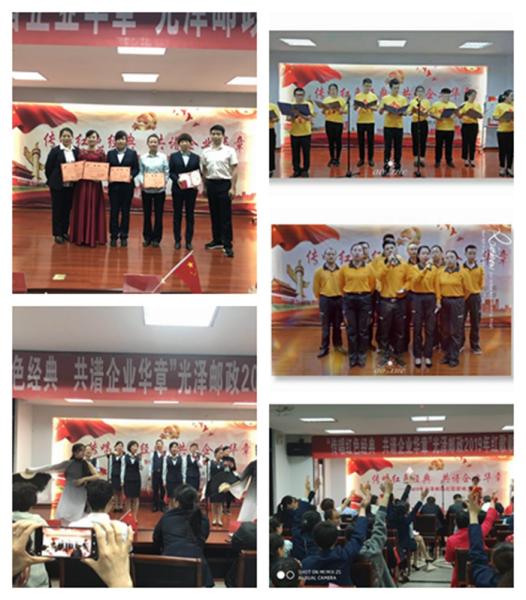 为传承红色精神,献礼祖国70周年华诞。5月8日晚在五楼会议厅,光泽县分公司工会组织职工开展以“传唱红色经典 共谱企业华章”为主题的红色经典歌曲大赛活动,来自全县邮政120余名干部职工参加了活动。活动现场彩旗招展,激情四射,隆重热烈。大赛首先对获得2019年市分公司首季度经营竞赛奖项的先进集体和个人进行表彰。随后,歌咏大赛在雄壮激昂的乐曲声中拉开序幕。来自机关、网点支局的10支参赛队伍,他们激情满怀,斗志昂扬、歌声嘹亮,热情饱满地演绎着《歌唱祖国》、《我和我的祖国》、《我的中国心》等一首首耳熟能详的歌曲展现舞台,充分展现光泽邮政人热爱祖国,一心向着共产党的雄心壮志;光泽大学生筑梦团队朝气蓬勃,用铿锵有力的诗歌朗诵,深情诠释着五四精神,展露青年职工朝气蓬勃,积极向上的活力和风采,台下观众深受感染,凡响共鸣,响起一阵阵热情的掌声。活动中,还穿插了党建知识抢答,现场职工积极参与,踊跃抢答,将活动揿起了一个高潮。