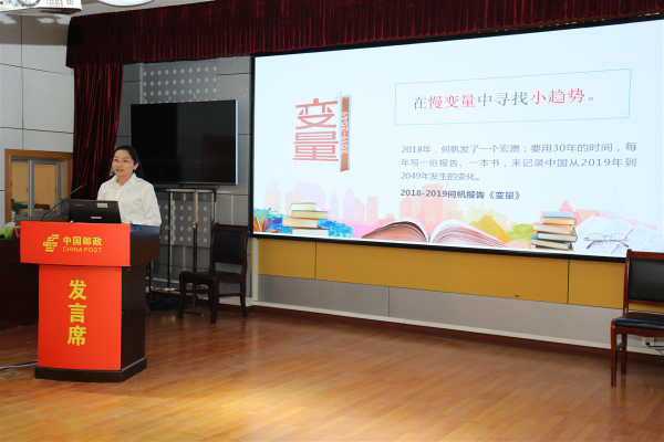 文进分享了《管理学》,从环境、决策、计划、组织、激励和控制等6个关键管理手段,领悟“管理一半是科学,一半是艺术,重在实践、领悟和积累”。包裹快递部经理赵玉露分享了《变量》,从中美博弈、技术赋能、新旧融合、自下而上、重建社群5个方面,帮你洞察新机会,获得历史感。金融业务部管理员周艳霞分享了《皮囊》,她从本书的感人事例和经典语句,说明了理想无关乎贫穷、富有、健康,不一定能实现,但一定是要有。渠道平台部汤莎分享《如何控制负面情绪》,情绪决定生活质量,疾病的根源就是负面情绪,控制负面情绪、享受健康和幸福。集邮与文化传媒部文李龙分享《傅雷家书》,长辈通过家书,把人生体验、道德修养传授后代,展现新时代人们对道德、思想、情操、文化修养的注重与追求。市速递物流公司万蓉分享《接纳孩子》,本书对中国父母教子的问题进行了系统地总结,结合案例理性分析,得出了最适合中国父母培养杰出孩子的方法。
