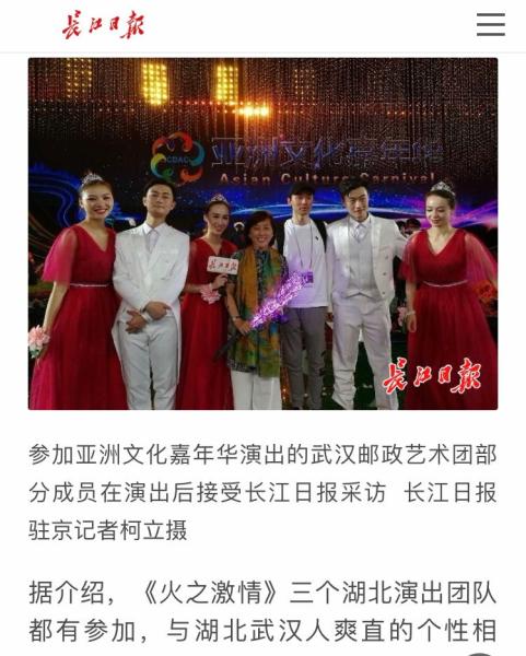 邮政艺术团的优秀表现受到了省内各大媒体的关注和争相报道。团长龚焰在接受《长江日报》记者采访时说:“《火之激情》节目因需要与外国艺术家同台,音乐合成难度很大。有些国外艺术团队前期排练的音乐与嘉年华演出的音乐有差别,必须重新录音合成,这个节目与多个外国演出团队合作,每来一个国家我们都要重新合成一次音乐,工作量是加倍的,对演员来说很具有挑战性。”