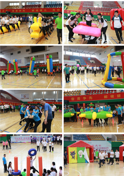 本次趣味运动会全市共有来自各支行和市分行机关三个队共16个代表队参赛。运动会共设有“旱地龙舟”、“万众一心”“快乐铅笔”、“趣味投篮”、“龟兔赛跑”、“超级汉诺塔”、“智取萝卜”、“飞镖足球”、“拔河”九个比赛项目。各参赛项目采用单项积分和总积分的方式确定比赛成绩,最后累计总分按分数高低排列名次。设单项团体奖、综合团体奖和优秀组织奖,