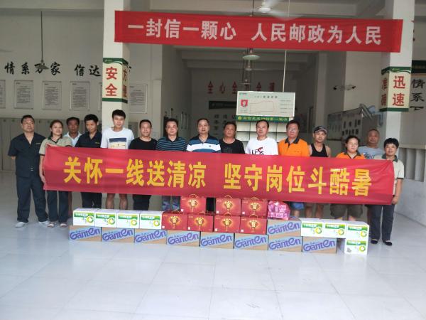 入伏以来,黄冈持续出现高温天气,气象台多次发布高温预警,给邮政生产经营特别是外勤作业带来考验。7月30-8月6日,市分公司组织开展了“夏送清凉”关爱员工活动,市分公司领导胡智宏、易礼军、李列,带上防暑降温慰问品走进基层,看望慰问高温下奋战在一线的员工,要求各单位切实做好防暑降温和后勤保障工作,将关心关爱送到员工的心坎上。
