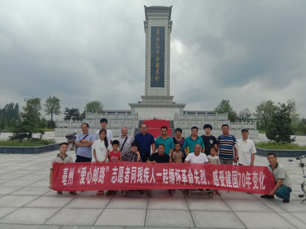 8月11日是第十个全国肢残人活动日,当日上午,安徽亳州市邮政分公司“爱心邮路”七位志愿者志愿者,驾驶着自己的车辆,带领“爱心邮路”上的困难残疾人,到亳州皖北烈士陵园,一起瞻仰革命烈士纪念碑,缅怀革命先烈,回忆革命艰苦岁月,共同感受建国70年变化。 为做好此项活动,让残疾人感受伟大祖国七十年来的变化,亳州市邮政工会精心组织,提前对接,专程驱车到偏远乡镇,去接那些平时因行动受限,不能出行的困难残疾人,与他们一起感受伟大祖国日新月异的变化。