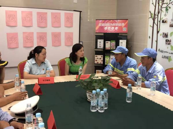 2019年8月13日上午9:30,长宁邮政支局联合江苏街道社区党建服务中心,在长宁邮政支局活动室,共同开展爱心接力站慰问交流会。 希望能借此了解一线户外工作者的日常,面对面倾听他们对爱心接力站使用至今的想法以及改善建议。长宁邮政支局支局长曹雯,支部书记黄芳亲自出席该活动,为交通协管员们,环卫工人代表送上夏日慰问礼品,表达了对他们工作的高度认可,感谢他们为这座城市的默默付出。