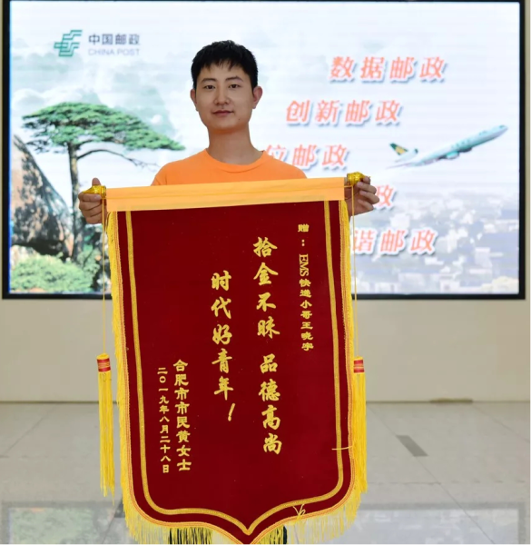 8月29日上午,合肥市民黄女士来到合肥市邮政分公司,向寄递部员工王晓宇同志赠送锦旗,称赞其为“时代好青年”。