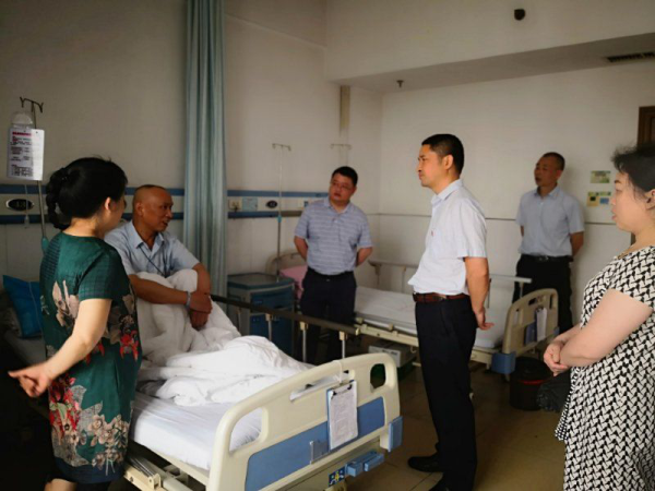 近日,益阳市分行工会主席夏剑、副主席刘志军、桃江县工会主席周馥一行来到桃江县人民医院慰问桃江县支行重病职工许卫民。在病房中,夏主席亲切的与许卫民同志交谈,询问他的病情、治疗情况及目前的家庭生活情况,并鼓励他一定要积极乐观,积极配合治疗,争取早日康复。随后,向其送上了慰问品及3万元慰问金。