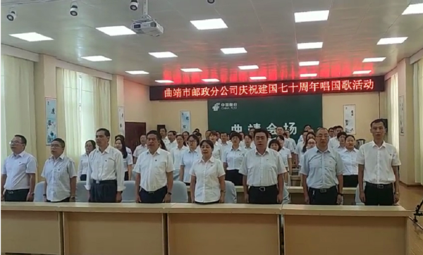 8月23日,曲靖市分公司工会组织开展同唱国歌活动,隆重庆祝祖国建国七十周年。通过同唱国歌活动,激发员工爱国主义热情,坚持中国共产党的领导,以习近平新时代中国特色社会主义思想为指引,为祖国繁荣昌盛贡献邮政力量。