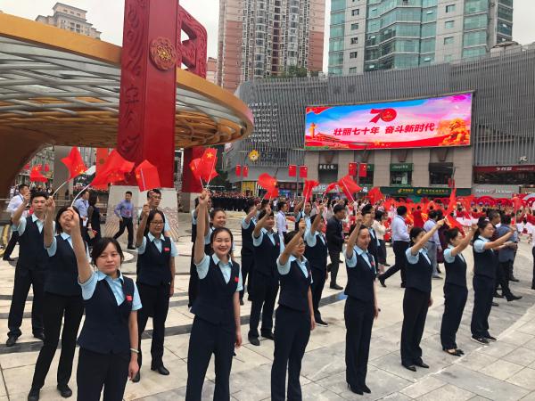 9月19日上午,重庆市九龙坡区分公司作为唯一一家企业,参与“迎国庆70周年.展九龙坡新风貌”系列活动启动仪式,九龙坡区商圈升级改造的亮相,活动现场揭开了九龙坡区新地标建筑“九龙门”的面纱,随着“九龙门”身披的红绸落下,也拉开了九龙坡区庆祝新中国成立70周年系列活动的序幕。活动中,九龙坡邮政组织30名邮政员工在杨家坪步行街参加祝福新中国成立70周年“快闪”拍摄活动,齐声高唱《我和我的祖国》。用昂扬的精神面貌展示邮政企业形象,深情祝福伟大祖国更加繁荣昌盛。