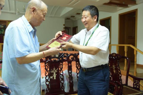 胡智宏为老人送上中共中央、国务院、中央军委颁发的“庆祝中华人民共和国成立70周年”纪念章,并亲手为其佩戴,并合影留念。最后,再三叮嘱老人保重身体,并叮嘱家人一定要照顾好老人的生活起居,祝愿老人健康长寿。